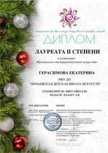 Поздравляем Герасимову Екатерину! Екатерина приняла участие во Всероссийском фестивале-конкурсе «Рождественский фейерверк талантов» и стала лауреатом 2 степени в номинации музыкально-инструментальное искусство. Преподаватель — Казаку Л.В.