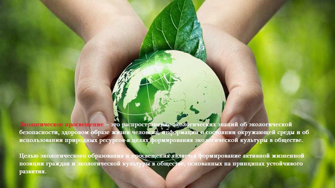 Экологическое просвещение — это распространение экологических знаний об экологической безопасности, здоровом образе жизни человека, информации о состоянии окружающей среды и об использовании природных ресурсов в целях формирования экологической культуры в обществе.